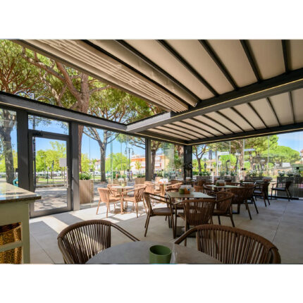 Dimensioni massime: L 400 x S 810 Consigliata per: Creazione di nuovi spazi living esterni, dehor per il settore hospitality e coperture per terrazzi esposti a forti sollecitazioni atmosferiche. Classe tecnica di resistenza al vento (UNI EN 13561): Classe 6.